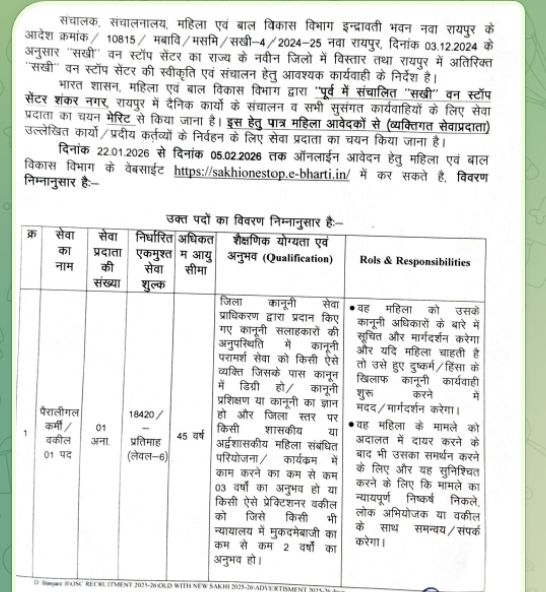 रायपुर। महिला एवं बाल विकास विभाग, छत्तीसगढ़ द्वारा महिलाओं की सुरक्षा और सहायता व्यवस्था को और अधिक सुदृढ़ करने की दिशा में एक अहम कदम उठाया गया है। विभाग ने ‘सखी वन स्टॉप सेंटर’ के राज्य में विस्तार तथा रायपुर में अतिरिक्त केंद्रों के संचालन को लेकर आधिकारिक विज्ञापन जारी किया है। यह विज्ञापन संचालनालय महिला एवं बाल विकास विभाग, इंद्रावती भवन, नवा रायपुर के निर्देशानुसार प्रकाशित किया गया है।